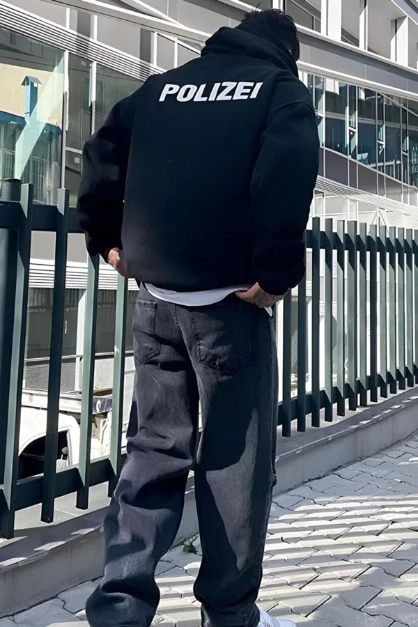 Sokak stiliyle öne çıkan siyah polizei baskılı kapüşonlu sweatshirt, günlük kullanımda rahatlık ve t…