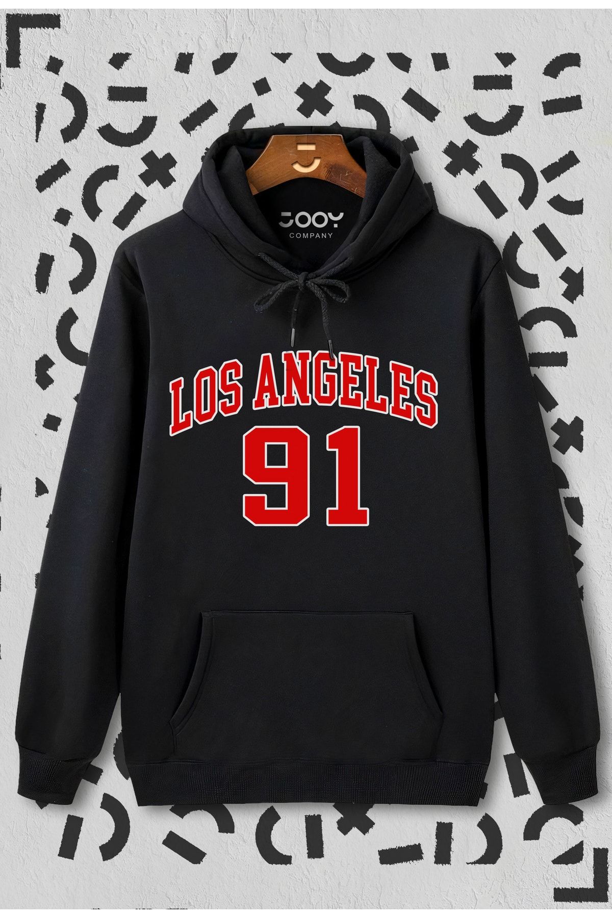 Los Angeles 91 Baskılı Siyah Kapüşonlu Sweatshirt