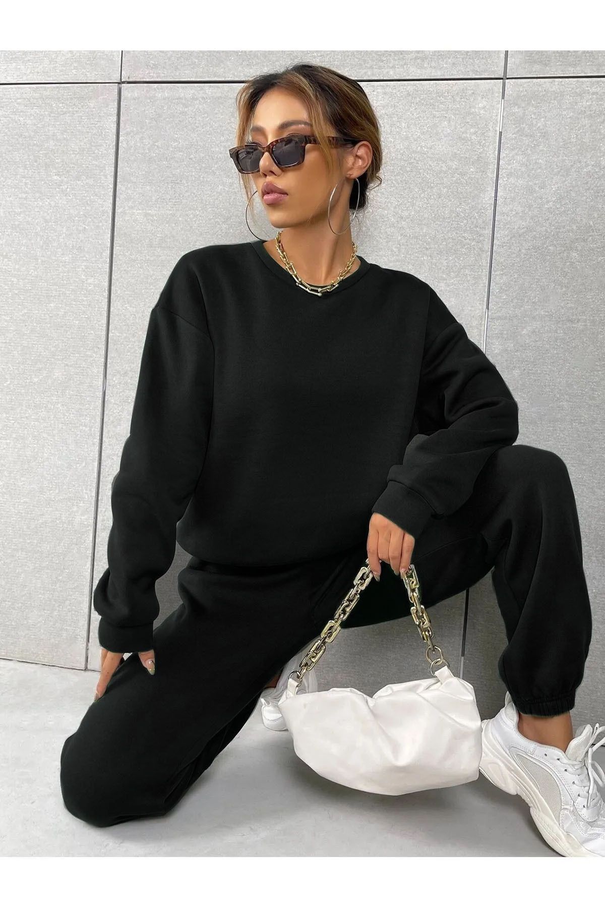 Siyah Bisiklet Yaka Sweatshirt Siyah Alt 3 İplik Kadın Eşofman Takımı