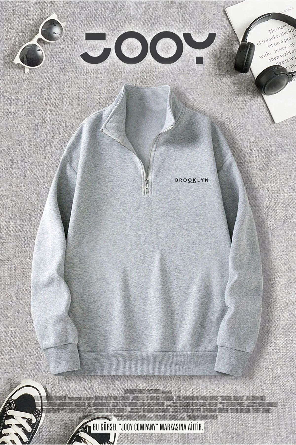 Yarım Fermuarlı Brooklyn Baskılı Gri Sweatshirt