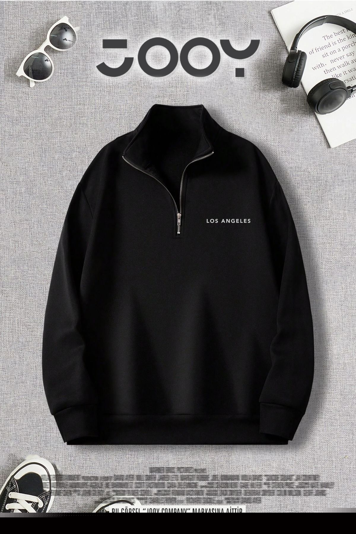 Yarım Fermuarlı Los Angeles Baskılı Siyah Sweatshirt