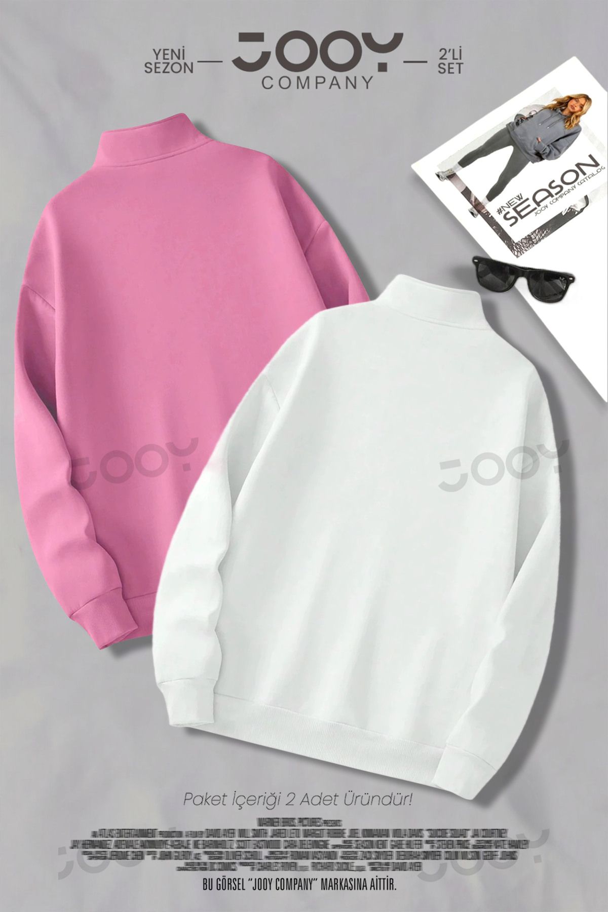 Yıldız Baskılı Yarım Fermuarlı Sweatshirt Pembe – Beyaz 2’li Kampanya Set