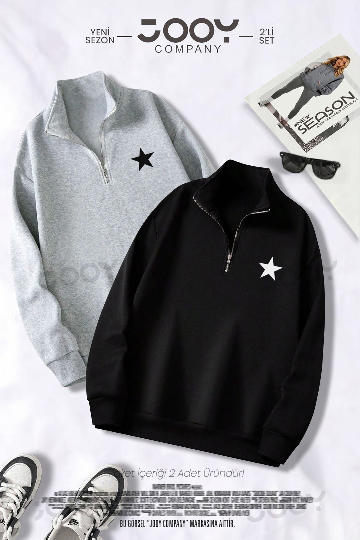 Yıldız Baskılı Yarım Fermuarlı Sweatshirt Siyah – Gri 2’li Kampanya Set